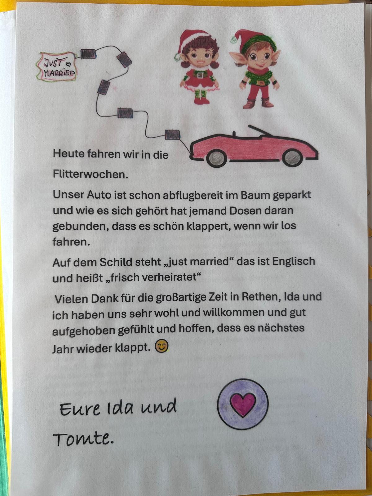 Wir werden die Kinder hier in und um Rethen niemals vergessen. Wir haben uns hier in eurem Dorf gefunden und lieben gelernt. Ihr habt jeden Schritt unserer Gemeinsamkeit begleitet. Ihr habt sooo schöne Lieder für uns gesungen, die süßer klangen, als jede Zuckerstange jemals schmecken kann. Wir haben ganz, ganz viele liebe Briefe, Gebäck und Bilder in unserem Wichtel-Briefkasten gefunden, das wir uns noch die nächsten 11 Monate daran erfreuen und uns kleine runde Wichtelkugelbäuche zusammennaschen können. Ihr habt so viele schöne Dinge gebastelt, das unsere Kleinzimmerwohnung ab jetzt nicht mehr aus 4, sondern aus 5 Wänden besteht, damit wir alles aufhängen und aufstellen können. Und ihr habt für uns gepoltert! Ooooh was habt ihr für einen ordentlichen Schabernack-Krach für die Ida und mich gemacht! Ein Nachbar aus dem St.Petri Weg, hat eben bei unserem Abflug noch geschimpft! Herrlich!