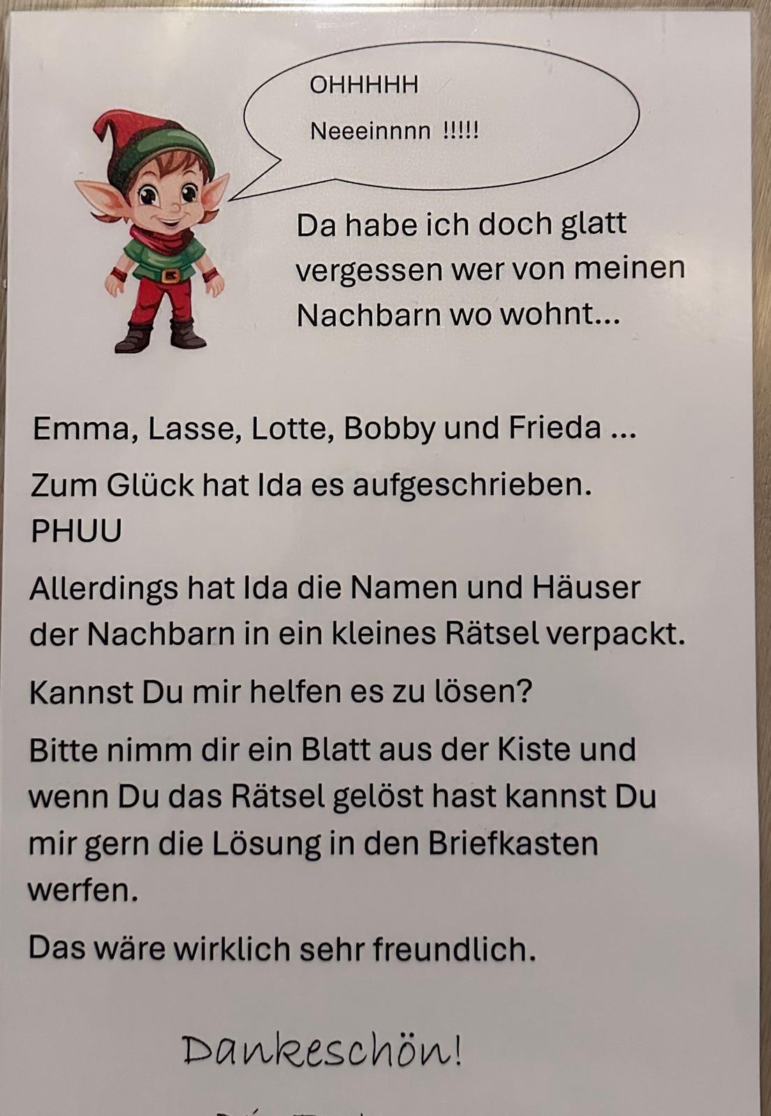 Wir haben euch Zettel mit Idas Wichtelrätsel in die Wichtelkiste gelegt.