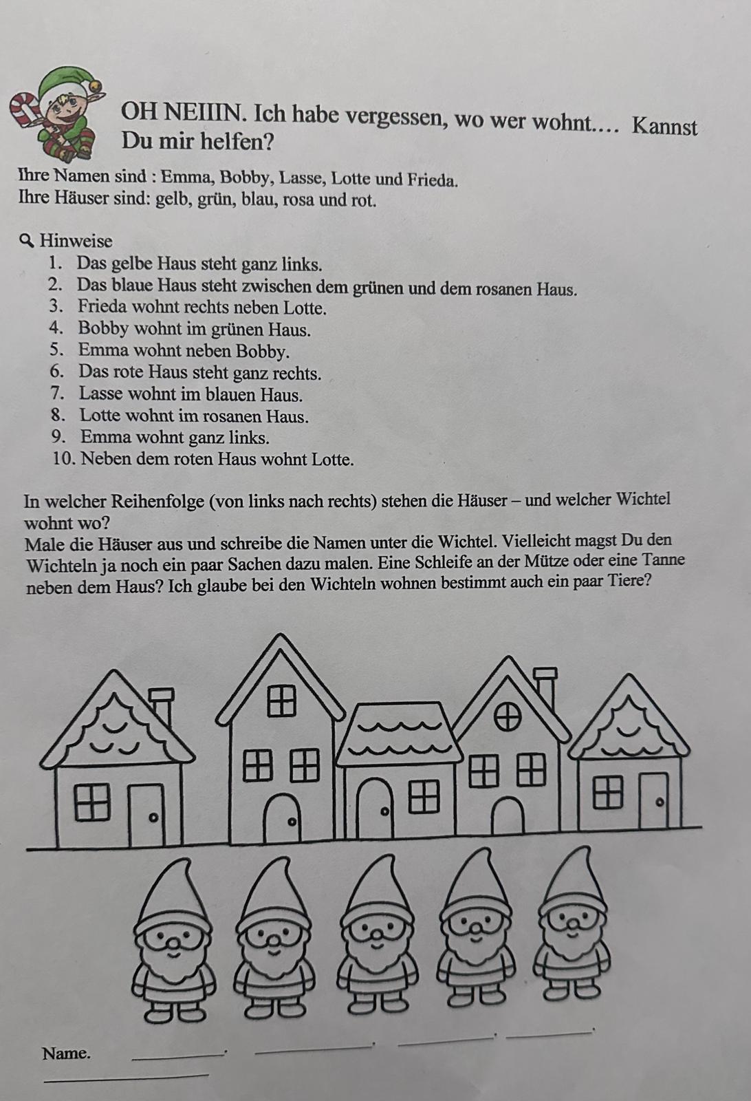 Wir wollten unsere Verwandten in Wichtelheim einen schönen Weihnachtsbrief zukommen lassen. Da man in Wichtelheim nicht wie bei euch Kindern eine Straße und eine Hausnummer angeben muss, sondern den Vornamen des Wichtels und die Farbe seines Hauses, sind wir mit unserer Adressliste ein wenig durcheinandergekommen. Ida hat zwar alles aufgeschrieben, es aber nach Wichtelart in ein Rätsel verpackt, welches wir selbst nicht mehr gelöst bekommen.
